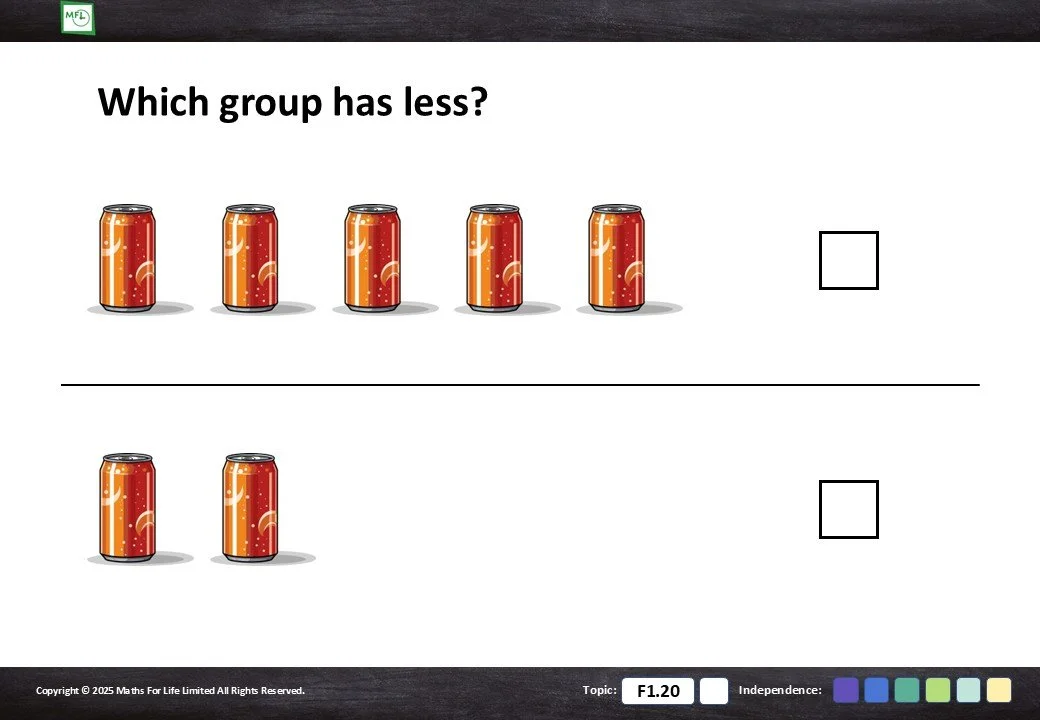 Identify the group that has less by comparing the groups, with increasing difficulty.