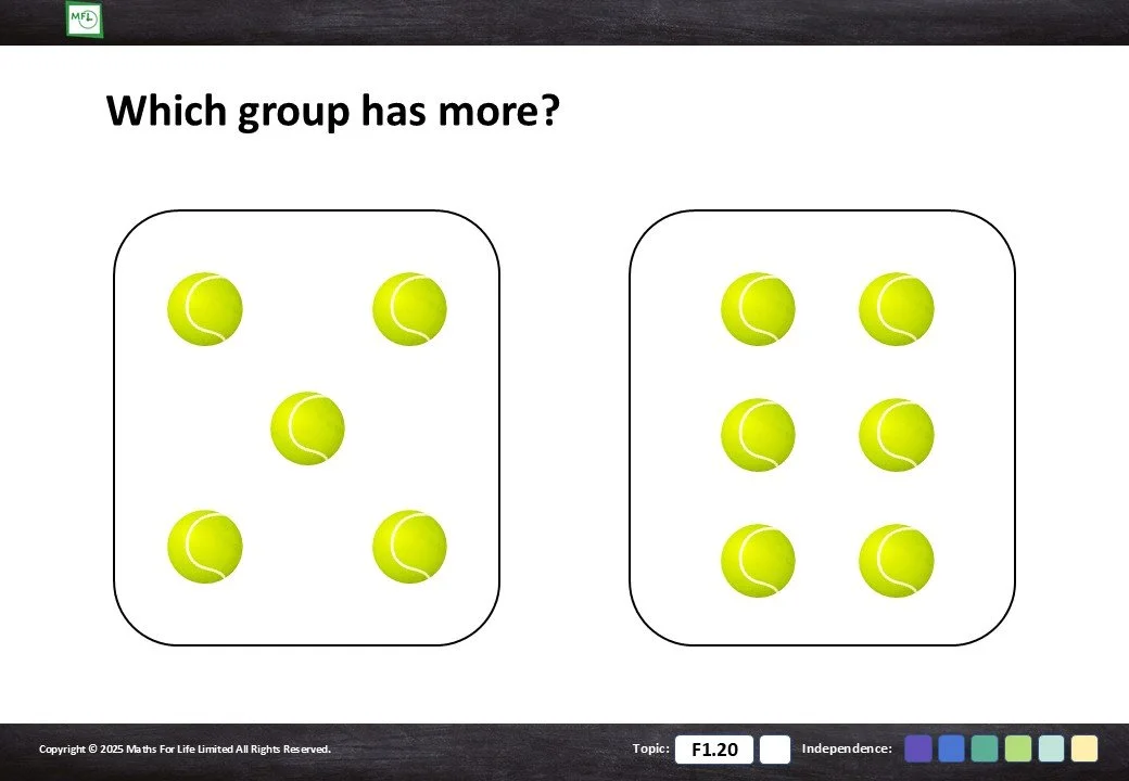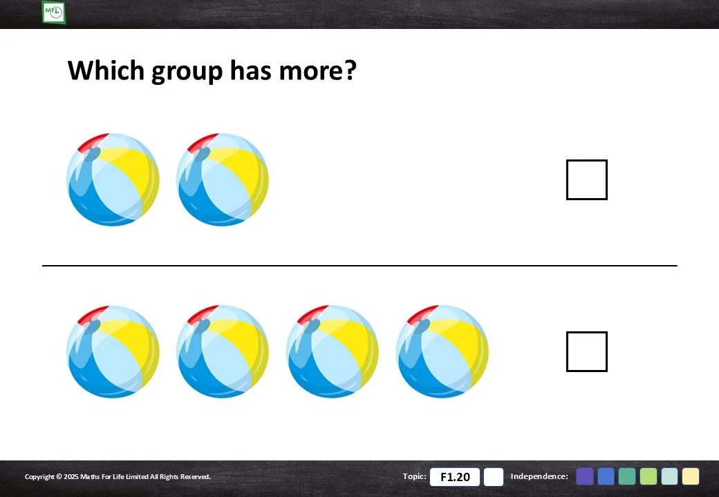 Identify the group that has more or less by comparing objects. Numbers up to 5.