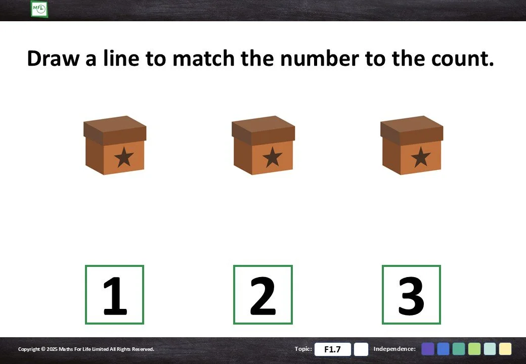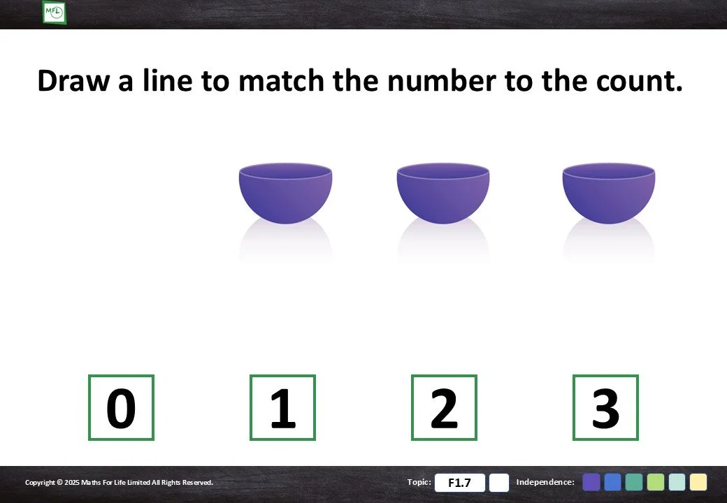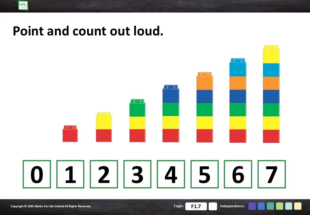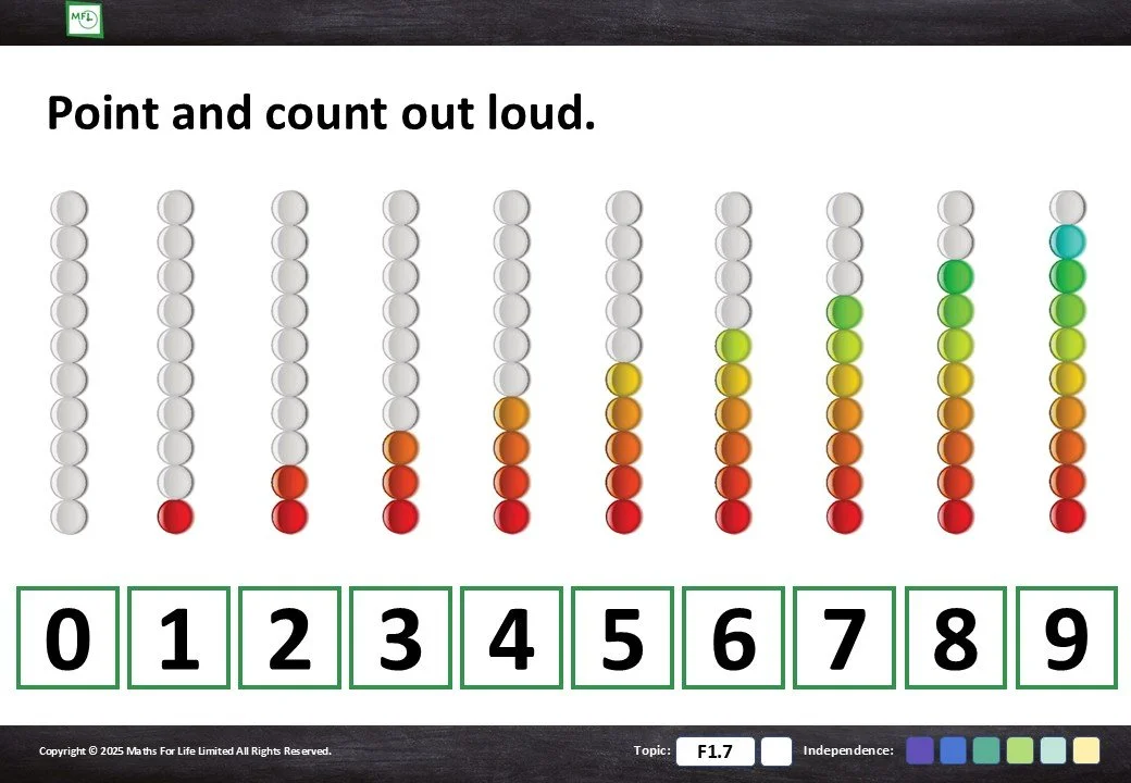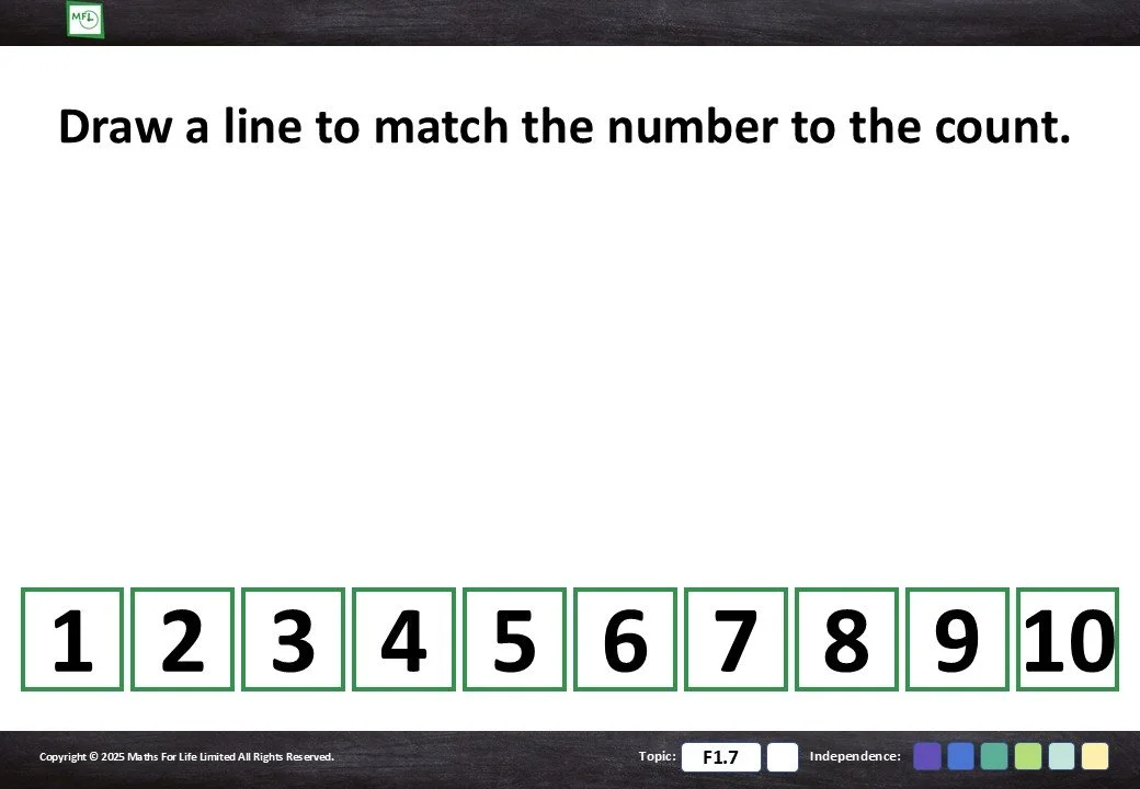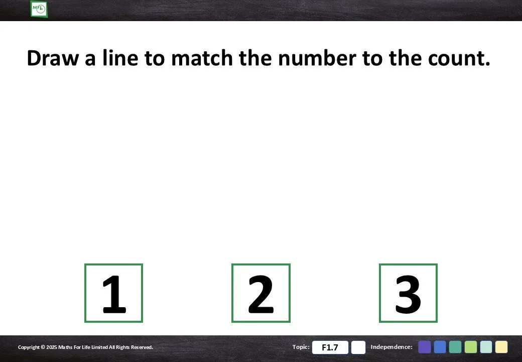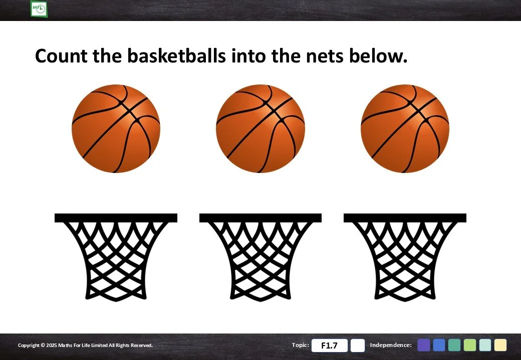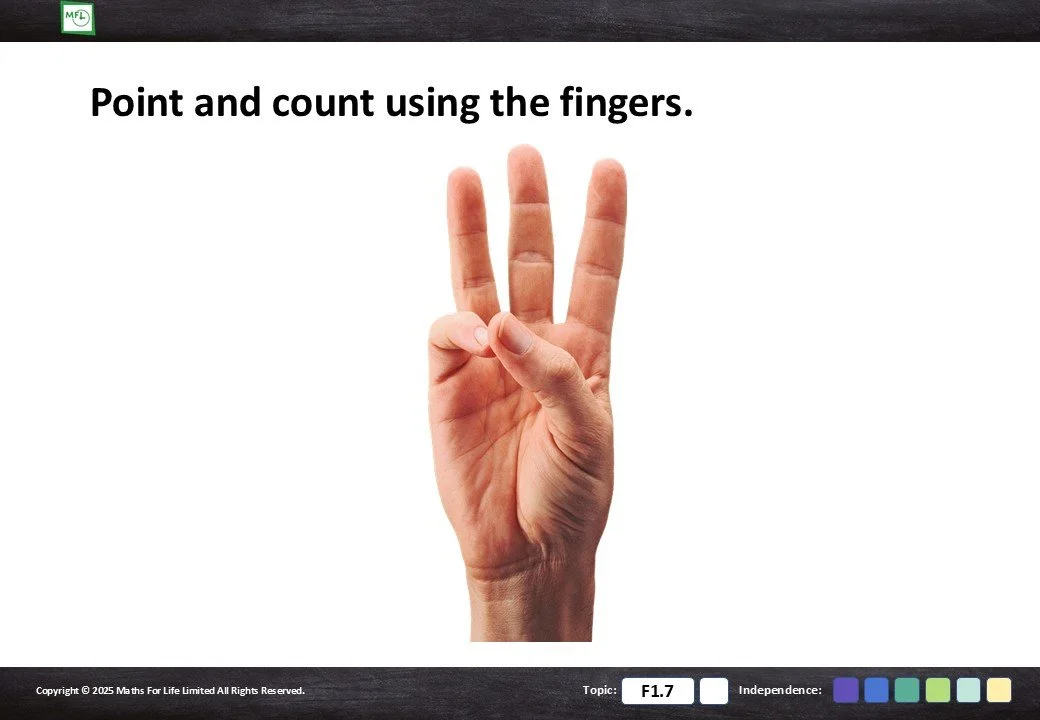 The objective is to say one number word for each item. For both verbal and non-verbal students this is usually accompanied with a sound or rhythmic action such as pointing, tapping, clapping or stepping.