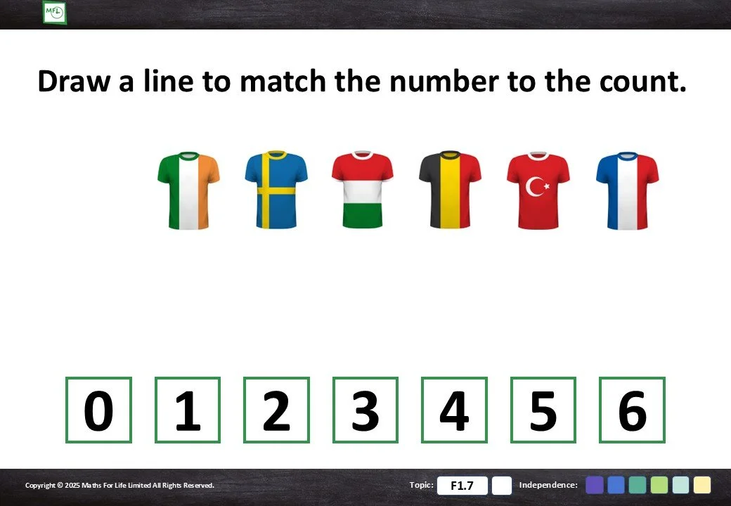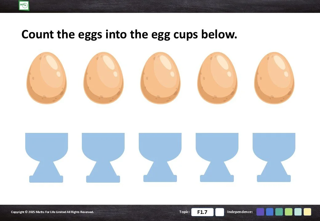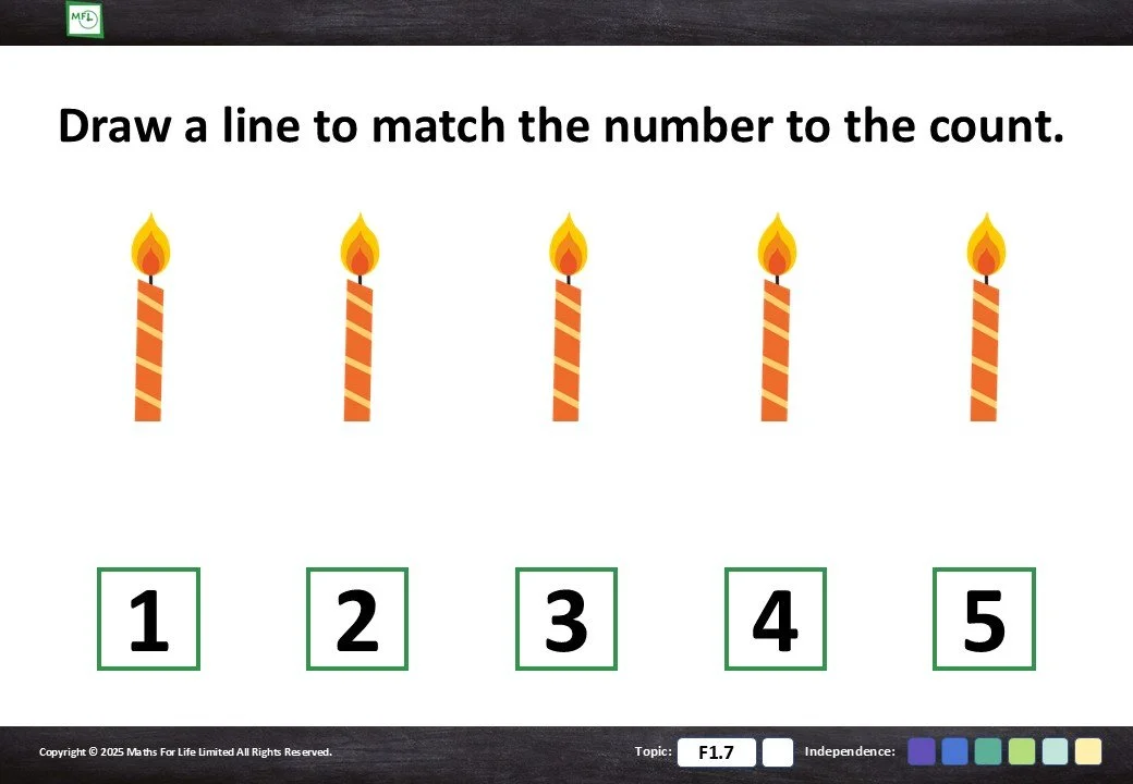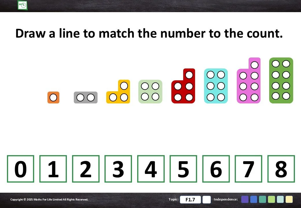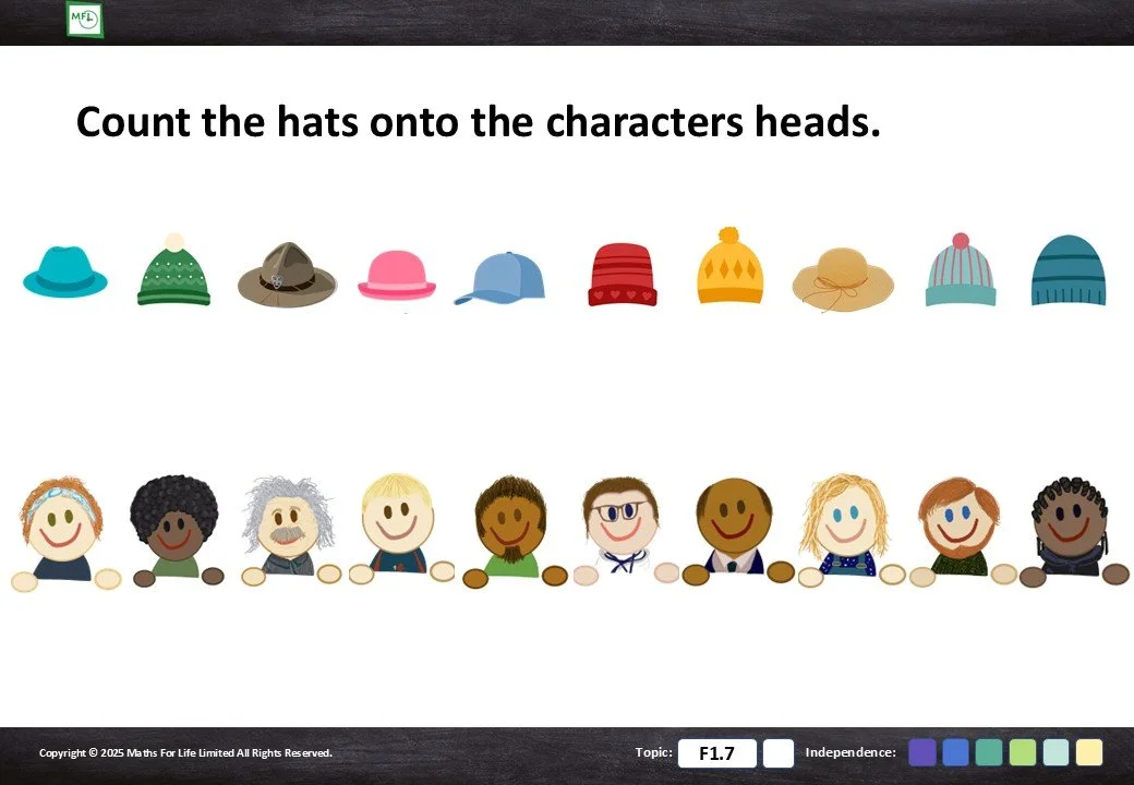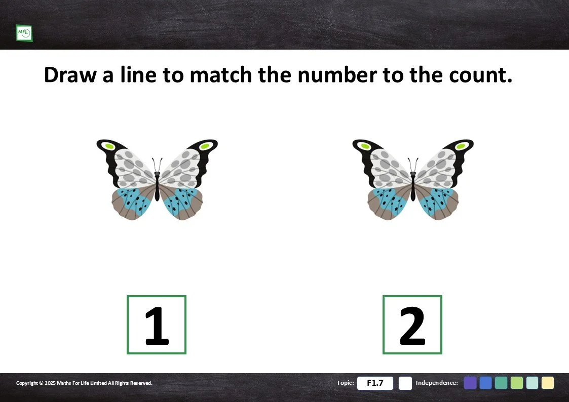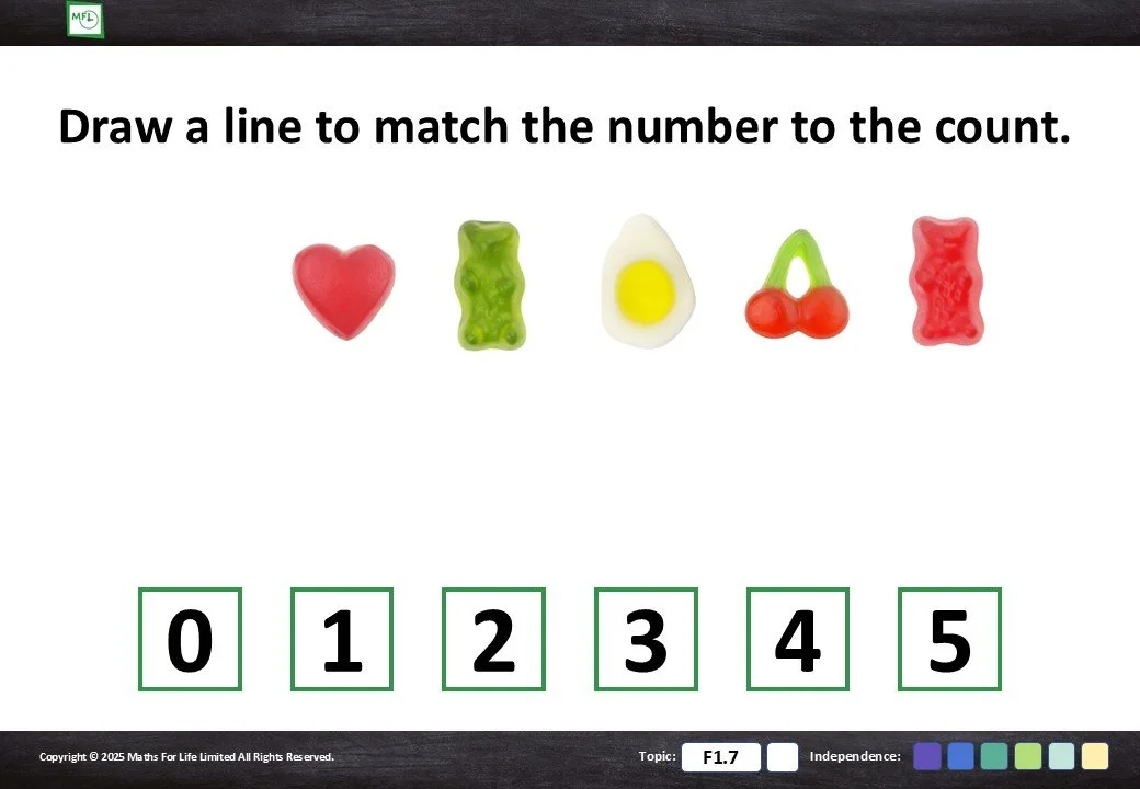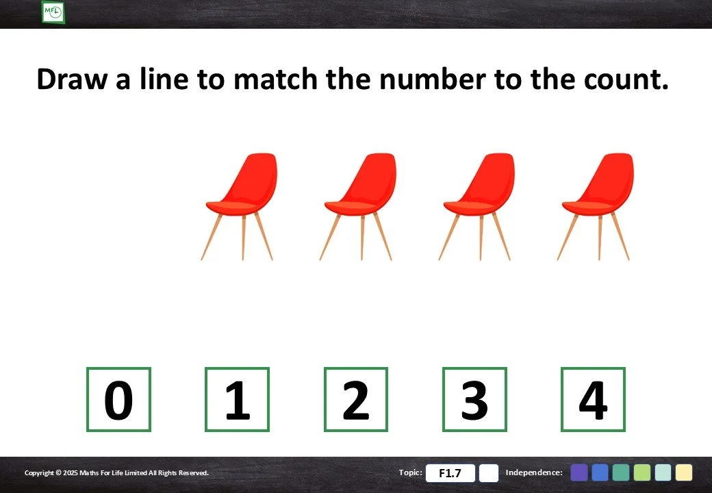 The objective is to say one number word for each item. For both verbal and non-verbal students this is usually accompanied with a sound or rhythmic action such as pointing, tapping, clapping or stepping.