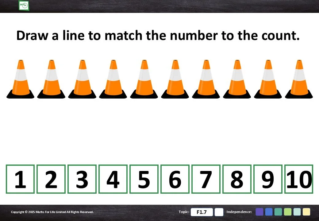 Count whilst matching the objects to the numbers from 1-2 to 1-10.