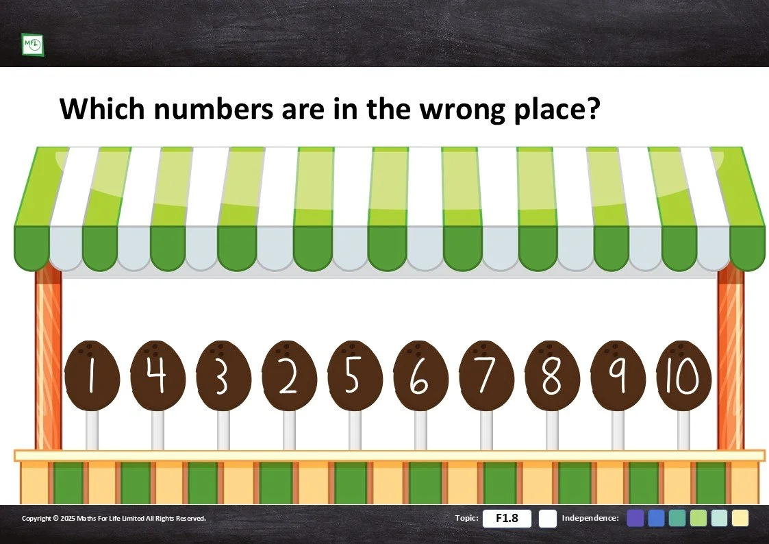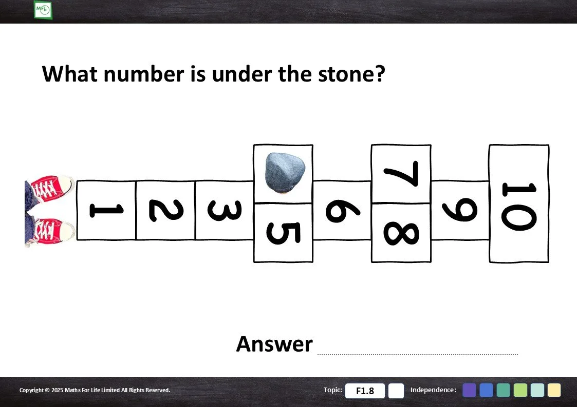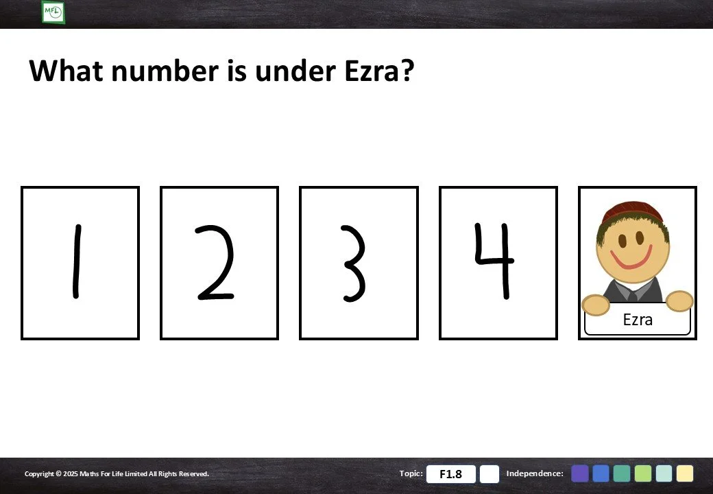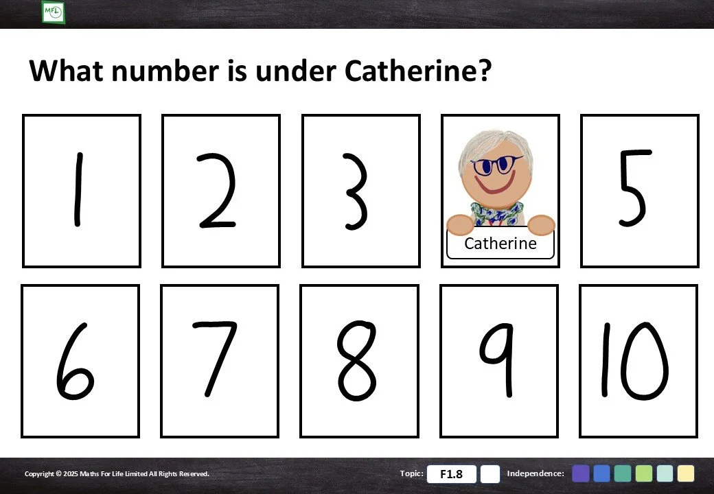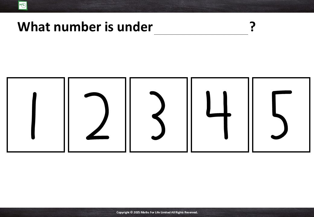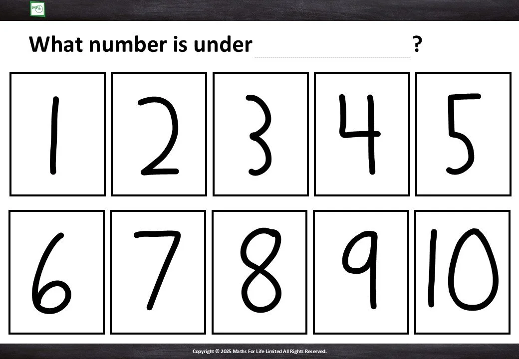 Identify ‘What number is under’ our Maths For Life characters. Starting with numbers 1-3, building to 1-10.