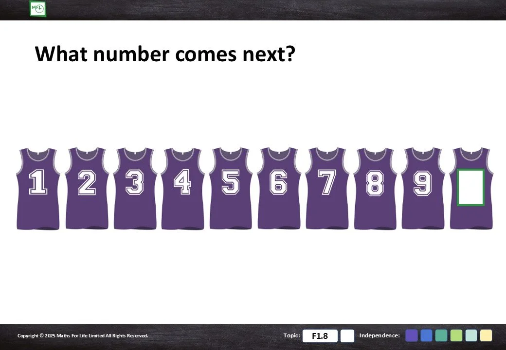 Count 1-10 completing the sequence or missing number on the jerseys.