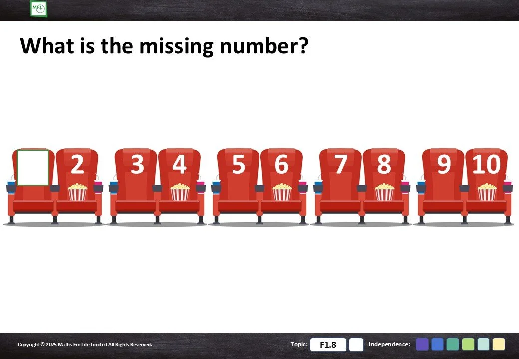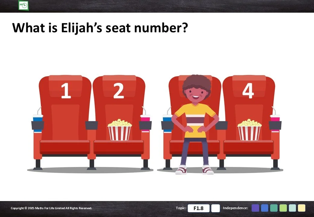 Starting with ‘What number comes next?’ and moving to identifying Elijah’s seat number. Numbers 1-10.