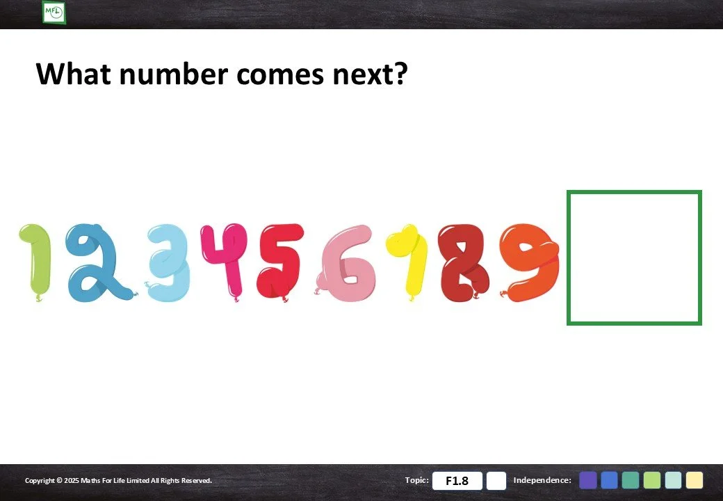 Decide ‘What number comes next’ in the balloon sequence. Starting with numbers 1-3, building to 1-10.