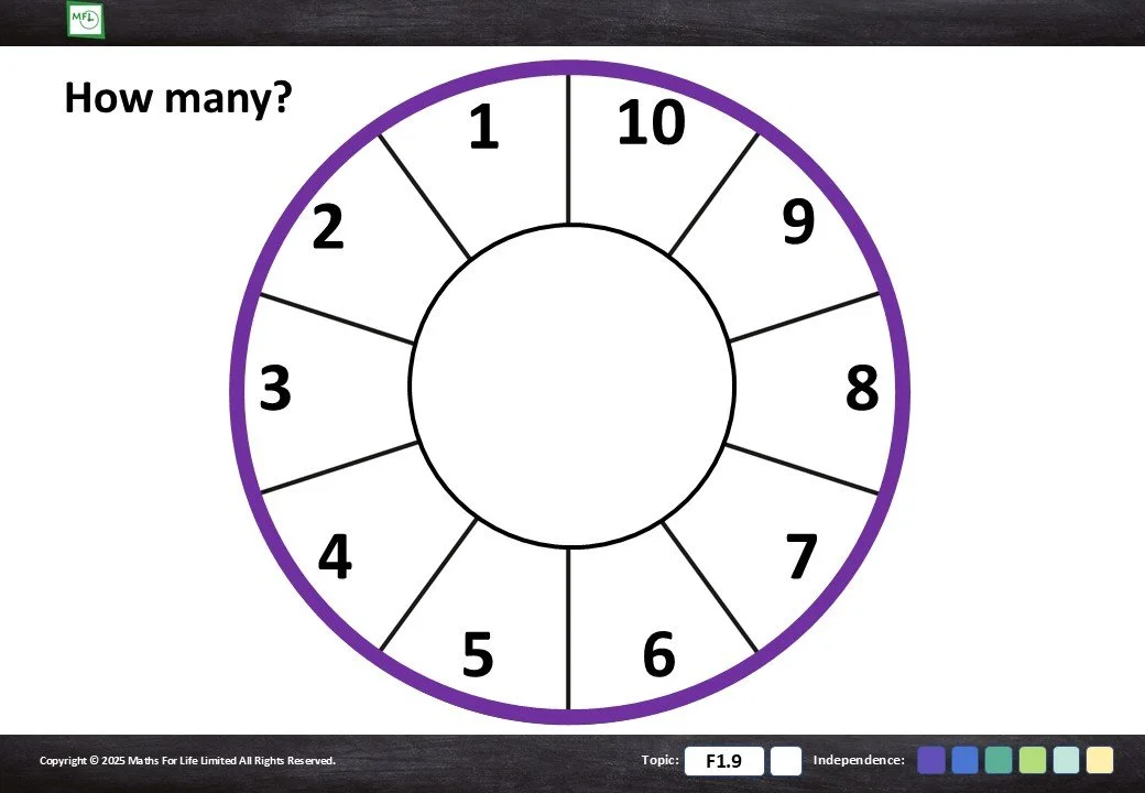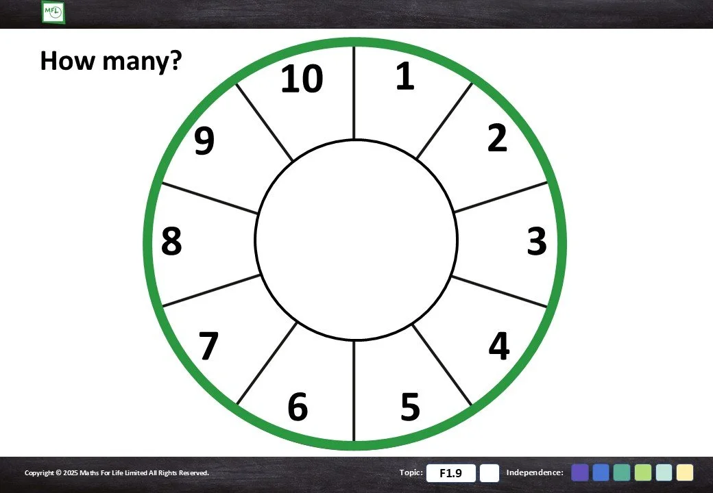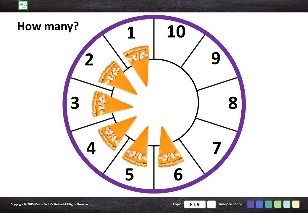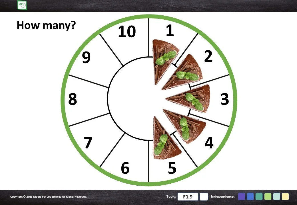 Count how many slices of cake in a circular format. Counting 1-10 anticlockwise.