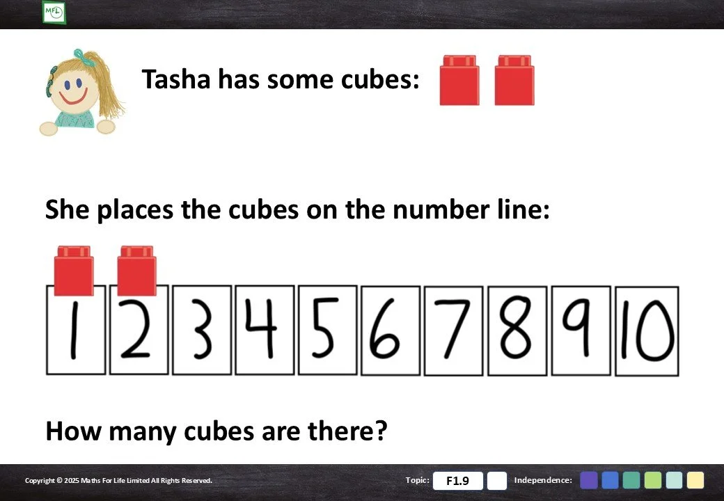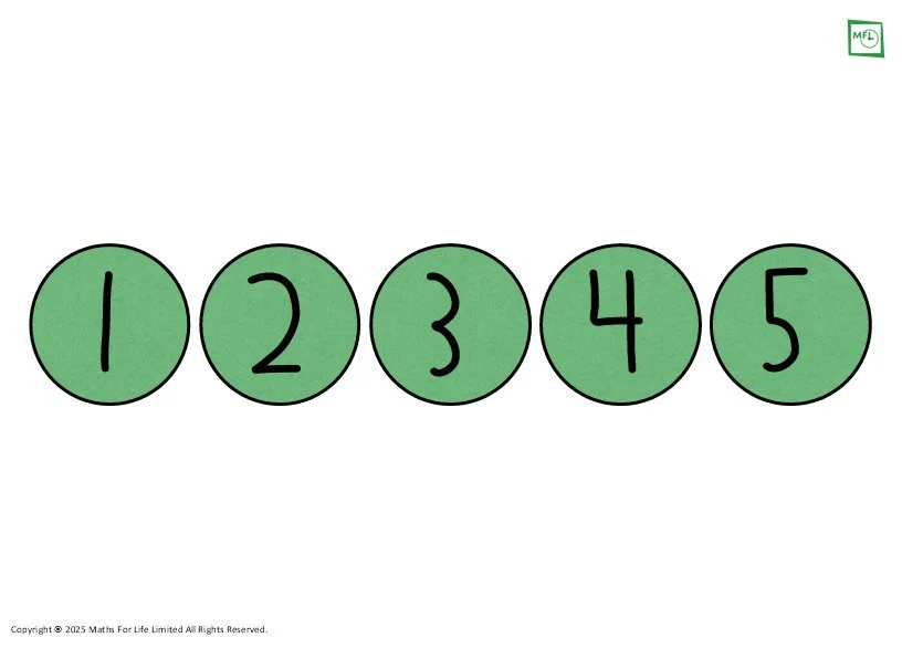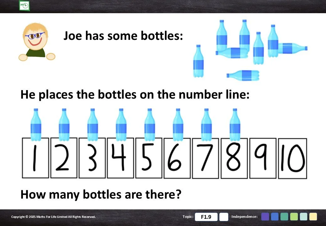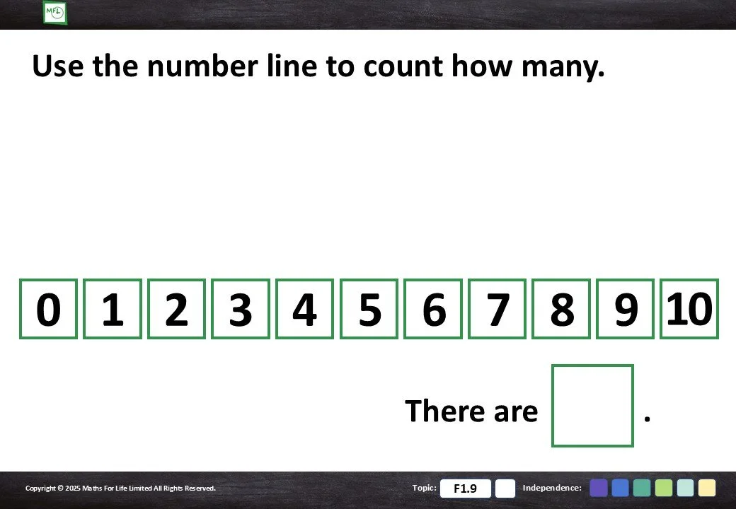 0-3, 0-5 and 0-10. Place items on top and ‘see’ that the last number counted is how many.
