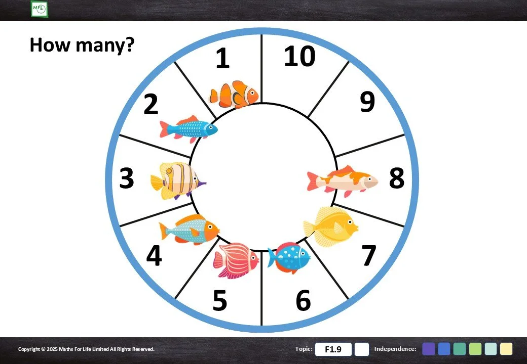 Count how many fish in a circular format. Counting 1-10 anticlockwise.