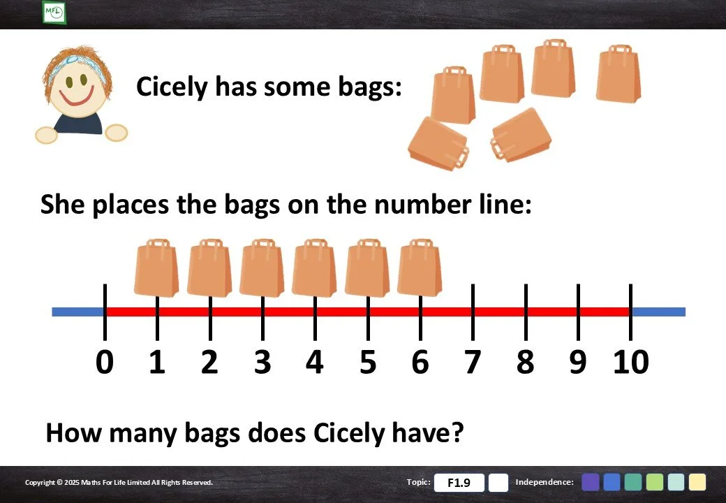 Place items on top and ‘see’ that the last number counted is how many. Demonstrate having zero.
