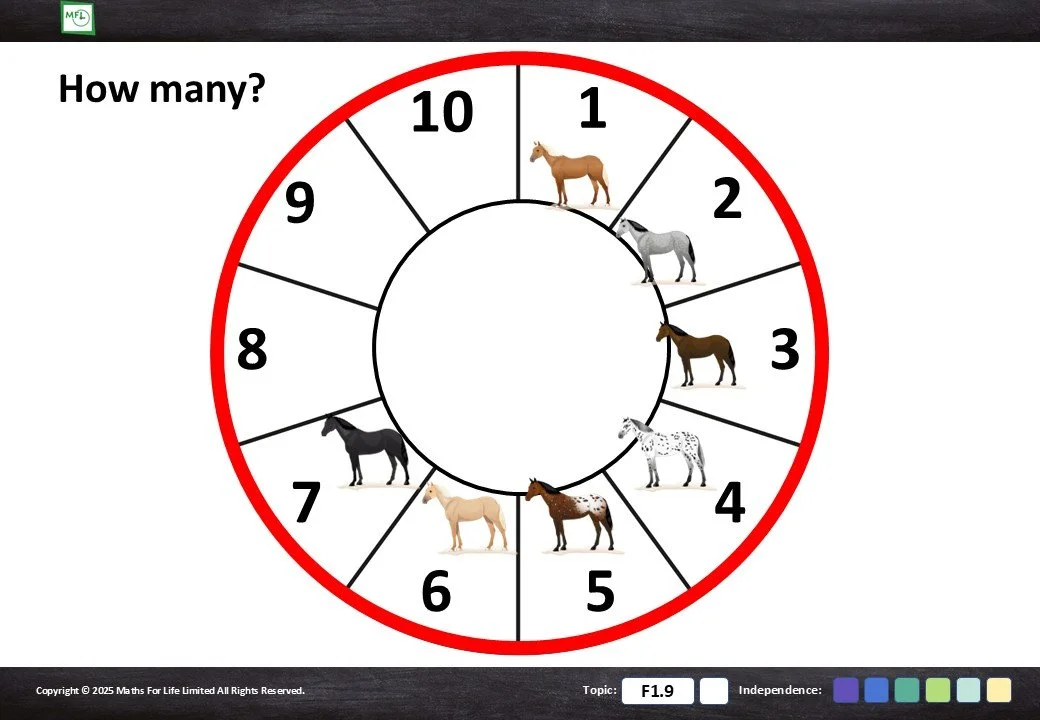 Count how many horses in a circular format. Counting 1-10 clockwise.