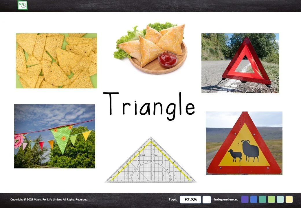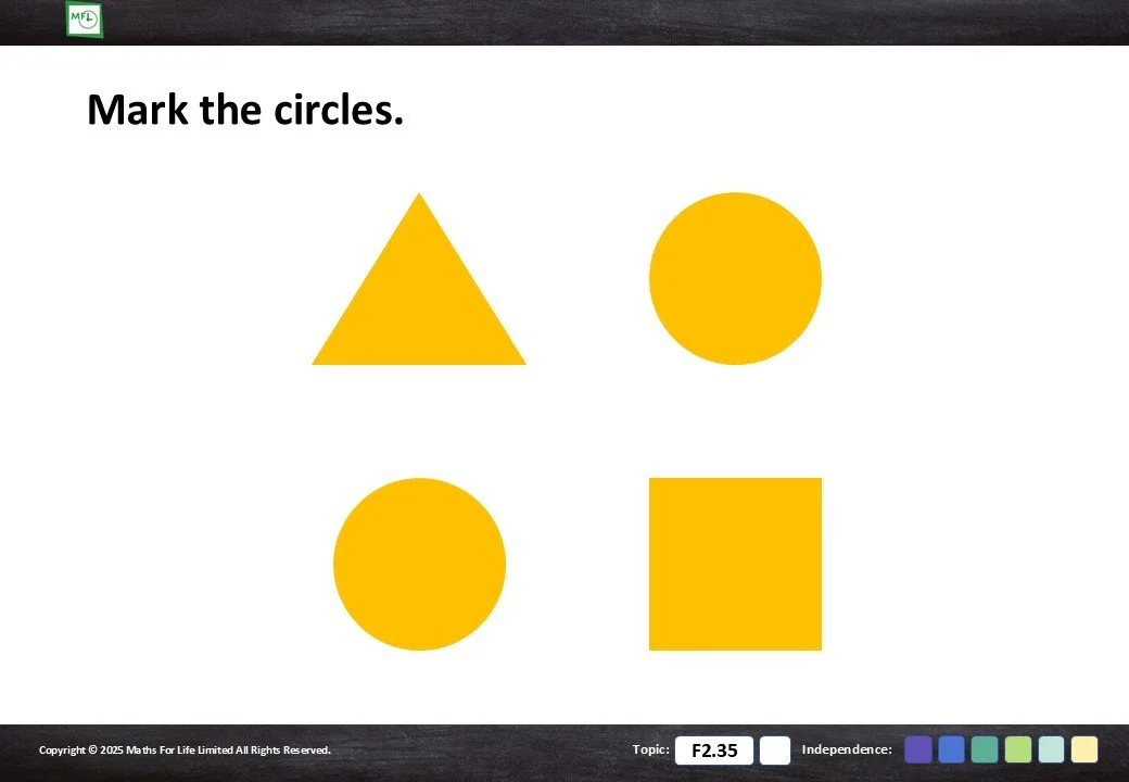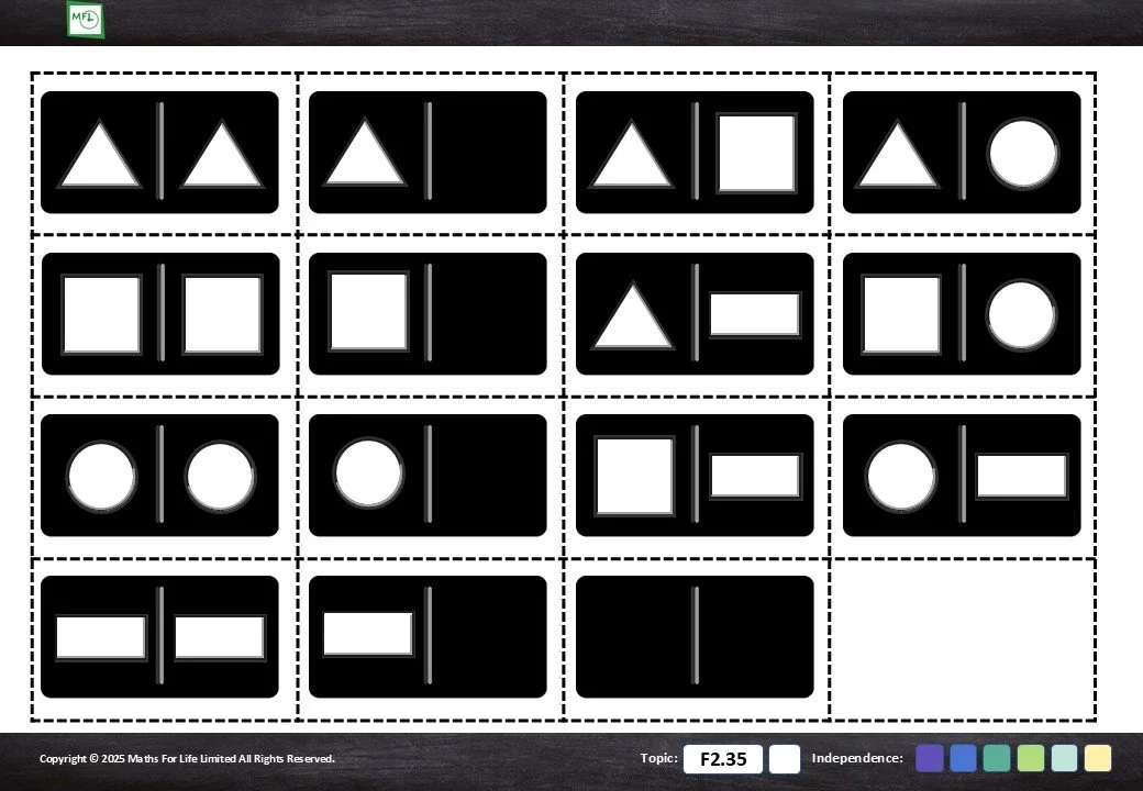 Identify 2-D shapes with increasing challenge of orientation, size and amount.