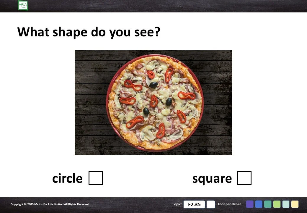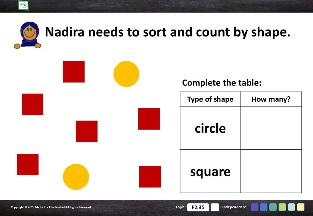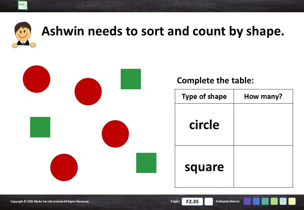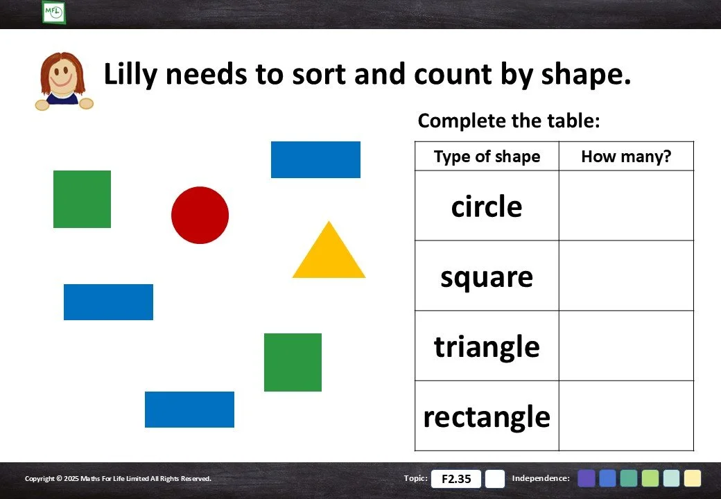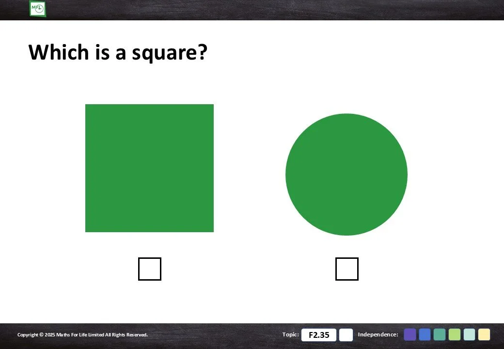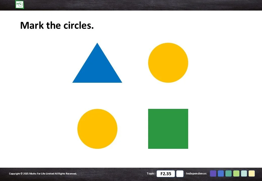 Identify 2-D shapes with increasing challenge, including changing colours.