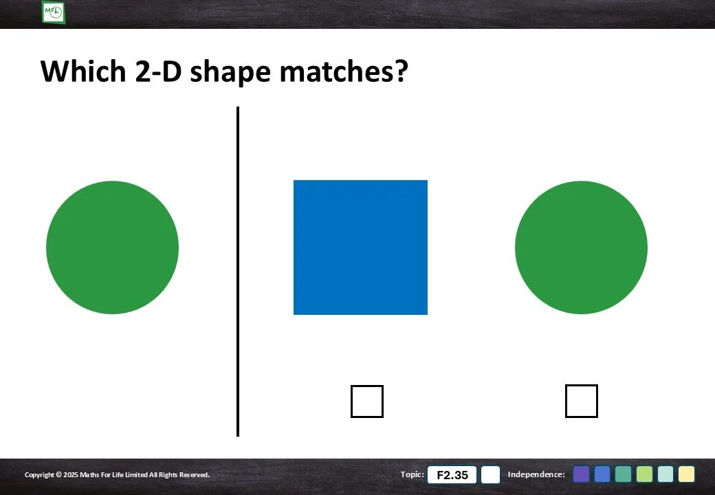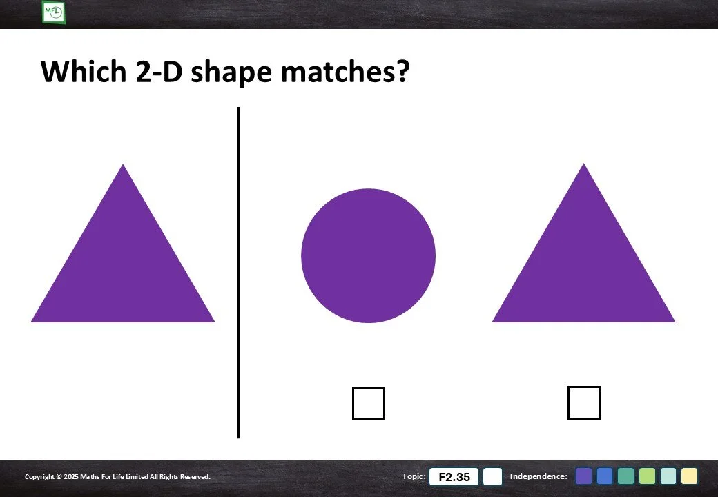 Match 2-D shapes, building from two choices to three choices with changing colours.