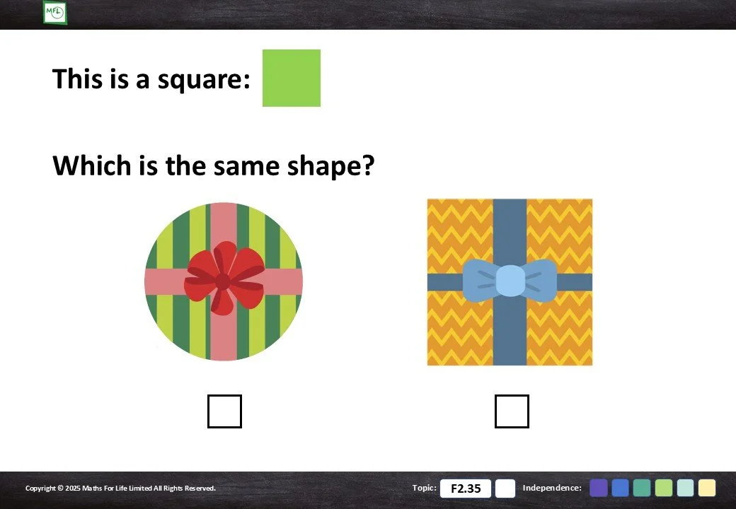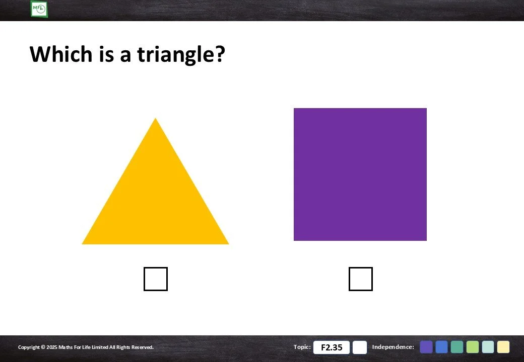 Recognise 2-D shapes, building from two choices to three choices with changing colours.