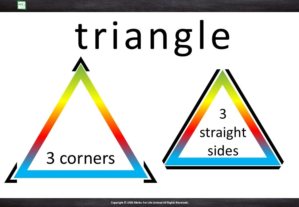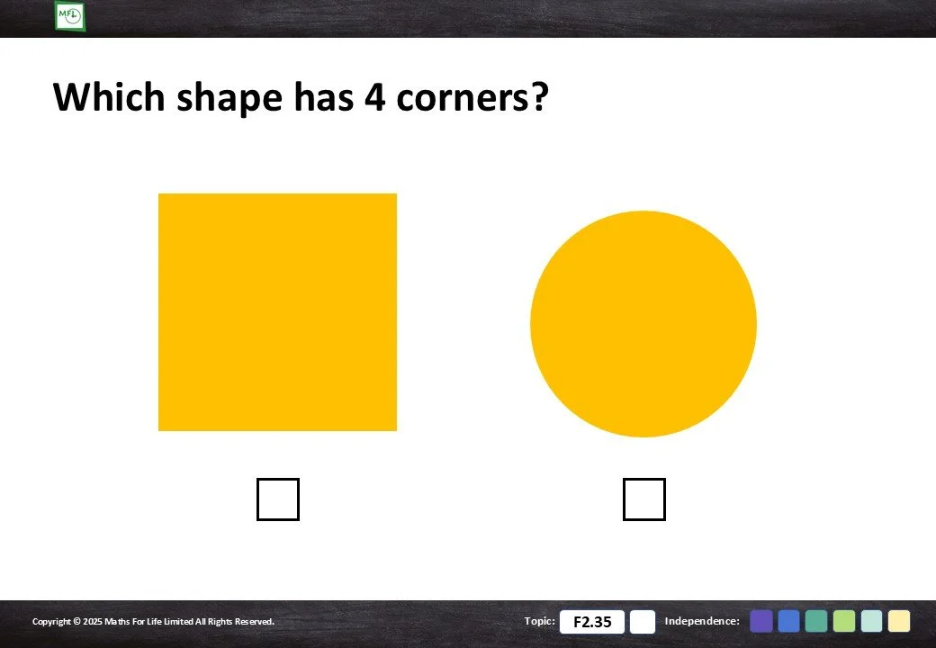 Recognise basic two dimensional ‘flat’ shapes and identify simple properties of corners and sides.